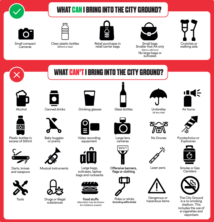 We encourage supporters not to bring a bag and only essential items, please ensure that any bags that are bought to the stadium are less than A4 in size. All bags are searched prior to entry.