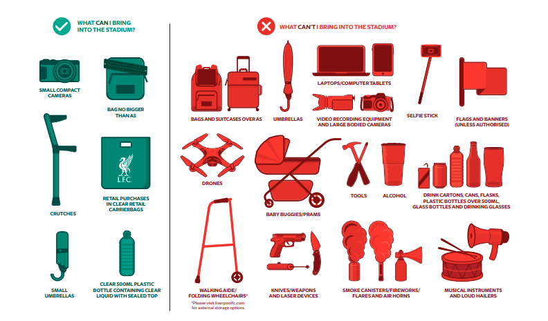 Any supporter who needs to bring an oversized bag for medical reasons are advised to inform the club via email at least 48hrs before the game. The request should be sent to the Disability Team at disability@liverpoolfc.com.